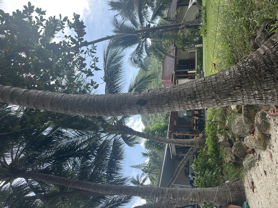 The image showcases a tropical scene, with palm trees dominating the foreground. The trunks are thick and textured, reaching up towards the partly cloudy sky. Lush greenery and what seems like a building with a brown roof and balcony are visible in the background. The bottom right corner reveals a sandy ground with some rocks and vegetation. The shot is taken from a slightly low angle, looking upwards.