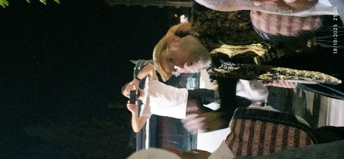 This image depicts a nighttime scene in Al-Kiswa, Syria, captured on 18/10/2025 at 21:38. In the immediate foreground, a man with a prominent white beard, fair hair, and glasses is visible, wearing a dark garment adorned with intricate gold embroidery and a light-colored, possibly straw, hat or head covering. His mouth is open, suggesting speech or song, and his right arm is blurred, indicating motion. To his left, the partial view of at least two other individuals is present, one wearing a striped vest or garment with brown and light-colored horizontal stripes. In the midground, a second man stands atop a white vehicle, possibly a van or bus, wearing a white t-shirt and dark trousers. He holds a black smartphone horizontally with both hands, apparently recording or photographing the event. The background is dark, consistent with night, with minimal environmental details visible beyond faint reflections and a small portion of green foliage in the upper right.