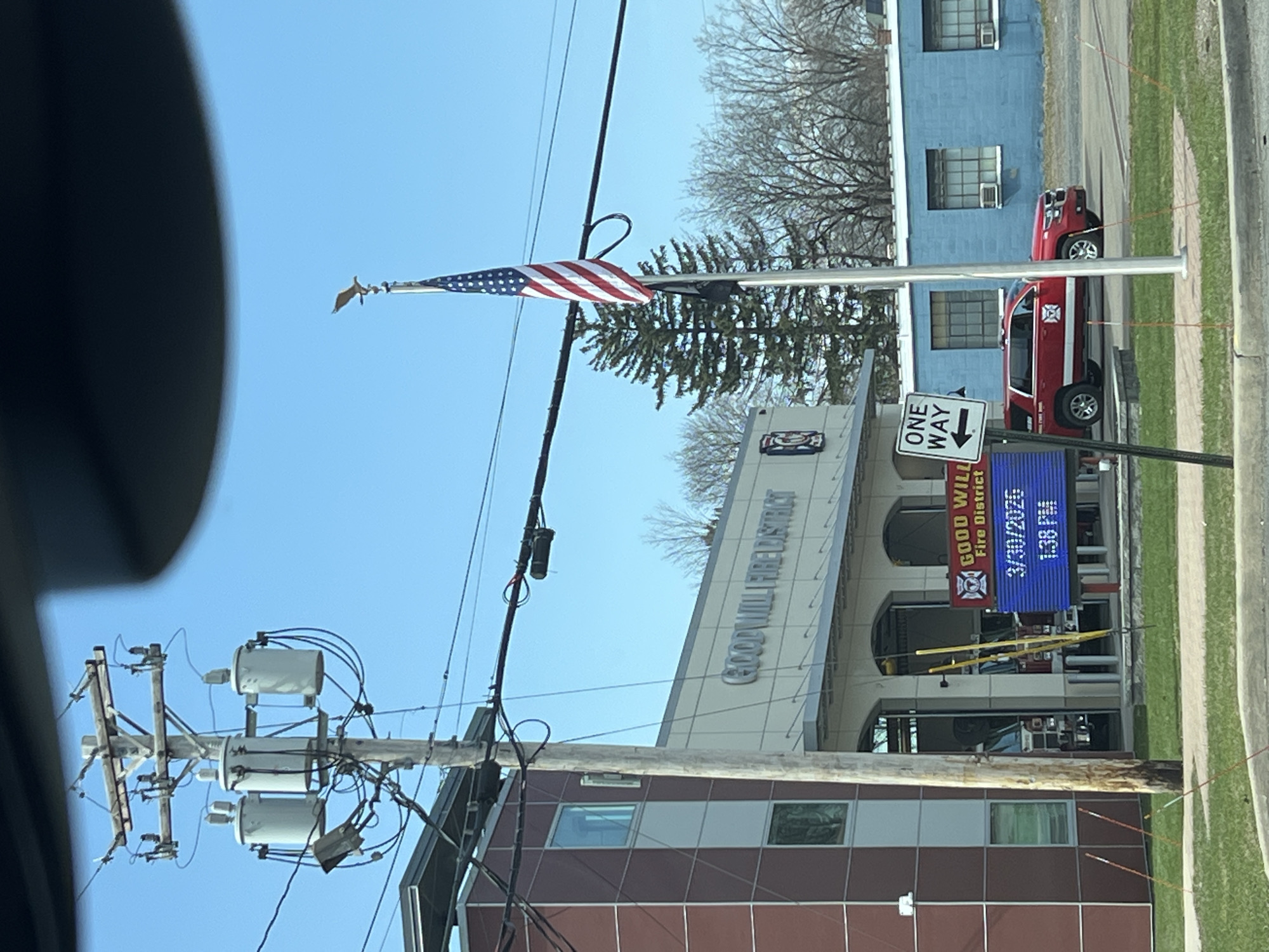 Good Will Fire District station in the City of Newburgh, United States of America. A United States flag is flying on a pole. A "ONE WAY" traffic sign is visible. The fire station displays "GOOD WILL Fire District". A digital sign shows "3/30/2026" and "1:38 PM". A fire truck is parked in the station. Power lines and a utility pole are in the foreground. A brown and white building is to the left of the fire station and a blue building is to the right.