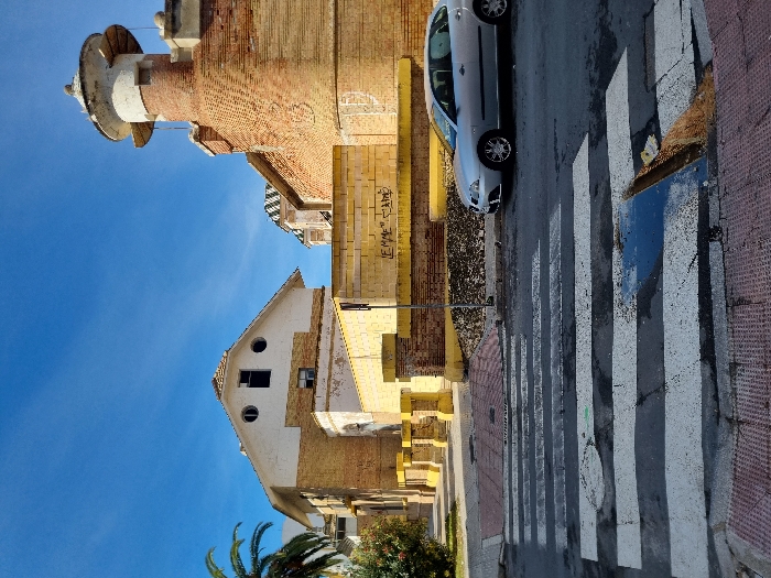 This image depicts a street scene in Huelva, Spain, specifically featuring elements of the Casa Colón complex, viewed from Calle Bartolomé de las Casas. The foreground shows a weathered asphalt road with a pedestrian crossing marked by white stripes, one section containing a reflective puddle. The pavement on both sides is a reddish-brown textured material. On the right, a silver five-door hatchback car, possibly a Seat Ibiza, is parked parallel to the curb. In the mid-ground and background, architectural structures dominate the scene under a clear blue sky with faint wisps of clouds. To the left, a multi-story building features a white-painted upper facade with a prominent gable, containing two circular windows and a dark rectangular opening, above a lower section of light yellow brick. Further right, a large structure built primarily of dark orange-red brick rises, culminating in a distinctive circular tower with a white, conical cap and open sections below. The lower part of this brick structure is a light yellow brick wall, covered with black and yellow graffiti. Between these main structures, another building with a patterned green and white tiled roof is partially visible. Sparse green foliage is present behind the left-side yellow brick wall, and a palm tree is partially visible on the far left. No people are present.