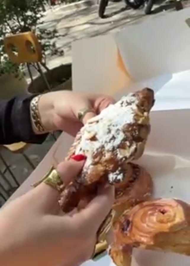A person with red nail polish and various gold rings and a gold bracelet on their left wrist breaks apart an almond croissant with powdered sugar on top. The croissant is being held over a white box with two pastries inside. In the background, a street with trees and two motorcycles parked on the sidewalk are visible. A yellow outdoor chair and potted plants are also visible near the box.