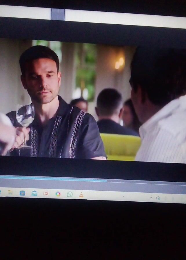 A man with short dark hair and a dark patterned shirt is shown in a close-up shot, sitting at a table. He is drinking from a wine glass. Other people are visible in the background, including the back of someone wearing a white shirt who is seated across from him. The scene appears to be taking place in a restaurant with natural light. The shot is captured from a screen, and part of a laptop with open icons and tabs is visible in the lower portion of the frame.