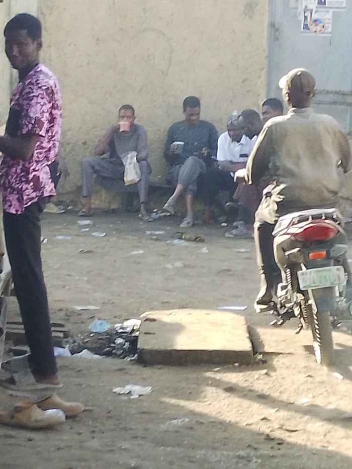 A group of men gather near a building, some sitting on a low wall, others standing. One man is drinking from a cup, another is using a mobile phone. Debris litters the ground. A man on a motorcycle faces away from the camera, obscuring some of the seated men. Another man stands on the left side of the frame, partially cut off by the edge. They all appear to be in an outdoor public space.