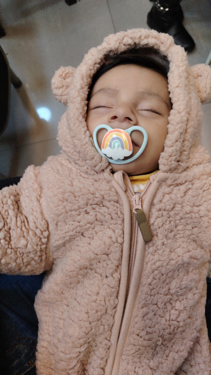 A sleeping infant is depicted in a close-up, high-angle view indoors in Barza Municipality, Syria. The infant wears a light pink, fuzzy hooded onesie with ear-like protrusions on the hood. A pacifier with a light blue base and a white circular face featuring a rainbow and cloud design is inserted into the infant's mouth. The infant's eyes are closed. A yellow and white striped garment is visible beneath the zipped onesie. The infant is resting on dark blue fabric, consistent with denim. The background includes light-colored flooring and a dark, indistinct object in the upper right.