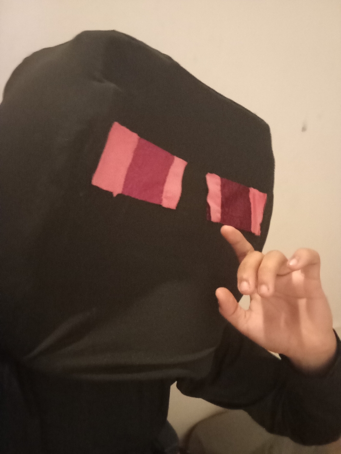 A person wearing a black, hooded garment with rectangular eye patches of pink and maroon stands against a light beige wall. Their hand, with fingers curled into a gesture, is raised near the right eye patch. The clothing seems to cover the wearer entirely, save for the exposed hand and part of the forearm. The fabric of the hood appears textured and slightly wrinkled.