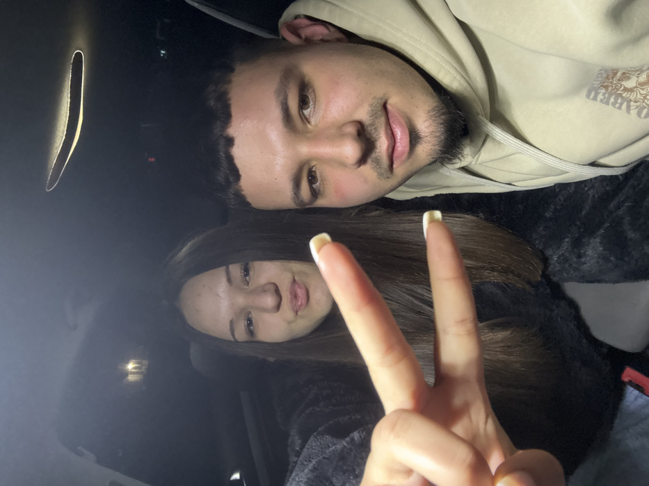 The image depicts two individuals, a female and a male, seated inside the dark cabin of a vehicle. The precise location within the city of Popovo, Bulgaria, is not discernible from the visual evidence. The female, positioned on the left, has long, straight dark brown hair. She wears a dark, fuzzy-textured garment. Her left hand is raised in the foreground, forming a 'peace sign' with extended index and middle fingers. Her fingernails are long and natural-colored or pale yellow. Her facial expression shows pursed lips. The male, positioned on the right, has short, dark hair with a distinct fringe. He exhibits a light mustache and a goatee. He is wearing a light beige or tan hooded sweatshirt with visible drawstrings and a faint graphic design on the lower right. His right cheek appears somewhat reddened. Both individuals are looking towards the camera. The vehicle's dark headliner and an elongated overhead light fixture or sunroof outline are visible. The ambient lighting is dim, suggesting nighttime. Faint external lights are visible through the vehicle's windows in the background.