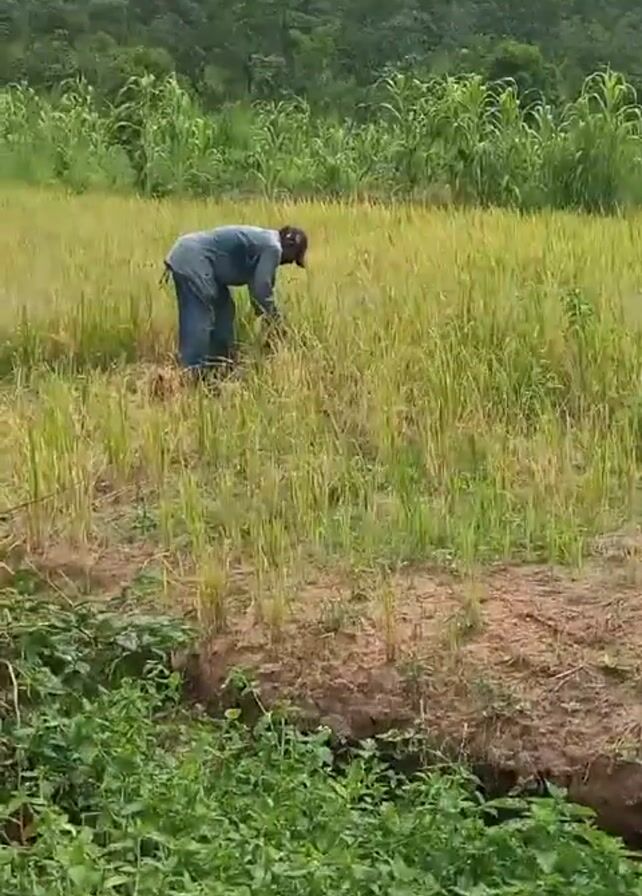 A person is working in a field of ripening rice or other grain. The person is bent over, apparently harvesting the crop with a hand tool. The field is surrounded by lush green vegetation and backed by a forested hill. The sky is overcast.