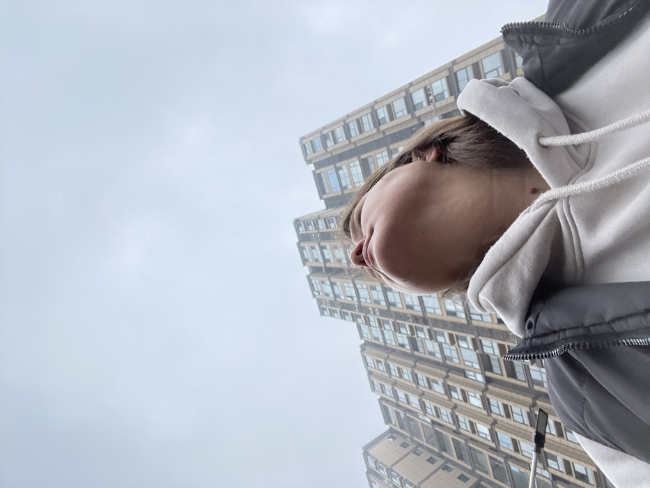 A low-angle shot showcases a person's face and part of their body, framed against a tall building and a cloudy sky. The individual wears a light-colored hoodie with the hood up, and a darker jacket. The building, with numerous windows, fills a significant portion of the background. The sky is overcast, creating a somber atmosphere. The perspective makes the building appear towering.