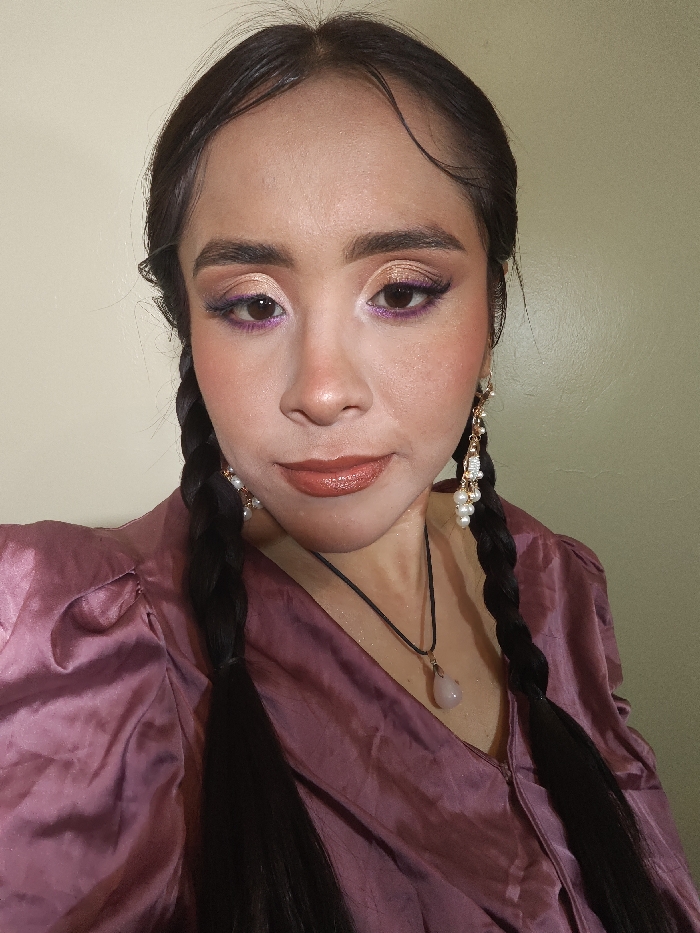 A person is centered in the frame, wearing a mauve, silky blouse with puffed sleeves. Two long, dark braids frame the face. The person wears gold and pearl earrings, and a rose quartz pendant on a black cord. The face features dramatic makeup: gold and purple eyeshadow, rosy cheeks, and glossy lips. A few wisps of hair fall on the forehead. The background is a plain, light green wall.