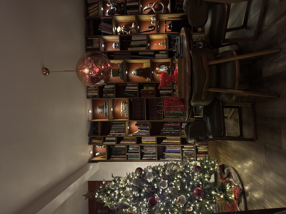 A room features a tall bookcase filled with books and decorative items. In the foreground, a Christmas tree adorned with lights and ornaments is visible. A round, reflective pendant light hangs from the ceiling. A wooden table with three chairs sits in the center of the room, adding to the cozy and festive atmosphere.