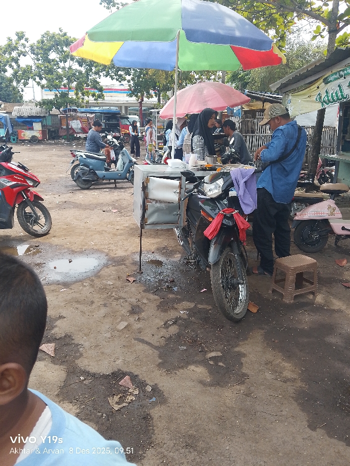 A marketplace scene shows a vendor in a blue shirt standing near a motorcycle with an attached food cart under a colorful umbrella. A customer wearing a headscarf stands nearby. A second umbrella shades the vendor. Other people and motorcycles fill the background, along with shops and other street vendors. A child's head and shoulder are visible in the foreground. The ground is uneven, showing dirt and small puddles.