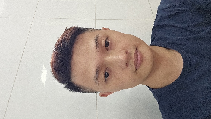 A man, wearing a dark blue t-shirt, looks directly at the camera. He has short dark hair and a neutral facial expression. He is standing against a white tiled wall. The location of the image is Phú Thượng, Vietnam, at latitude 21.08 and longitude 105.817.