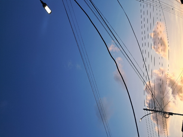 Looking upwards, the scene features a vivid blue sky transitioning to a soft sunset glow interspersed with fluffy white clouds. Power lines crisscross the sky, adding a geometric contrast to the natural beauty. A street lamp is visible on the left. Another streetlight with its arm extension sits near the clouds.