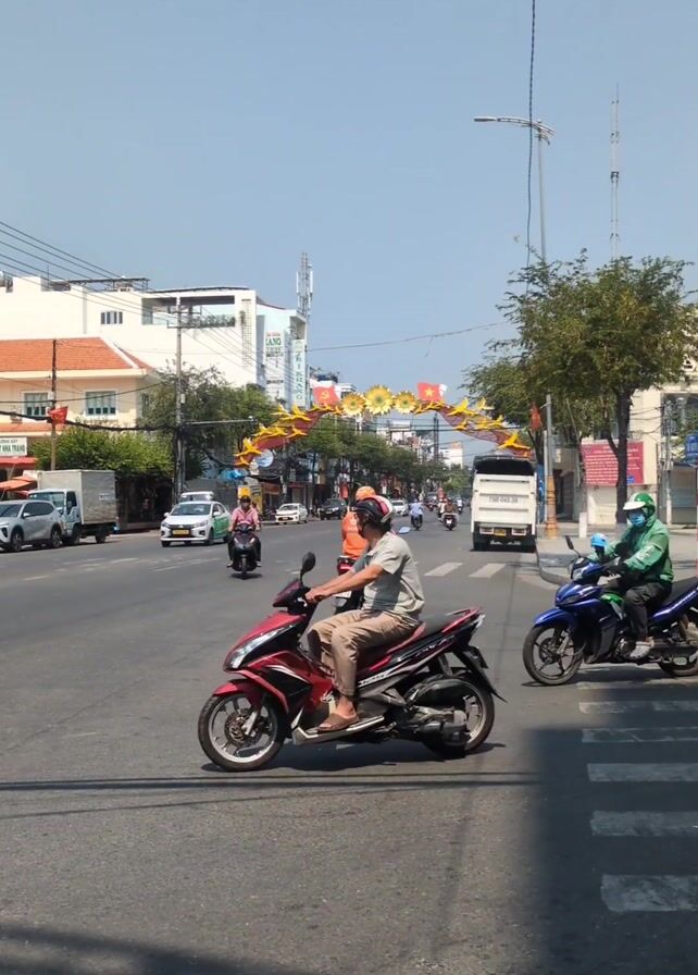 A bright day in Vietnam features a city street bustling with light vehicular traffic. Predominantly, motorcycles and scooters crisscross the two-lane thoroughfare. A few cars and trucks are also present in the mix of vehicles, contributing to the urban flow. Overhead, a decorative archway adorned with sunflowers and flags stretches across the road, marking what appears to be a symbolic entrance or boundary. The sidewalks are dotted with trees, and buildings line either side of the street, creating a typical urban landscape. The overall scene is a snapshot of everyday life in a Vietnamese city, with a clear blue sky serving as the backdrop.