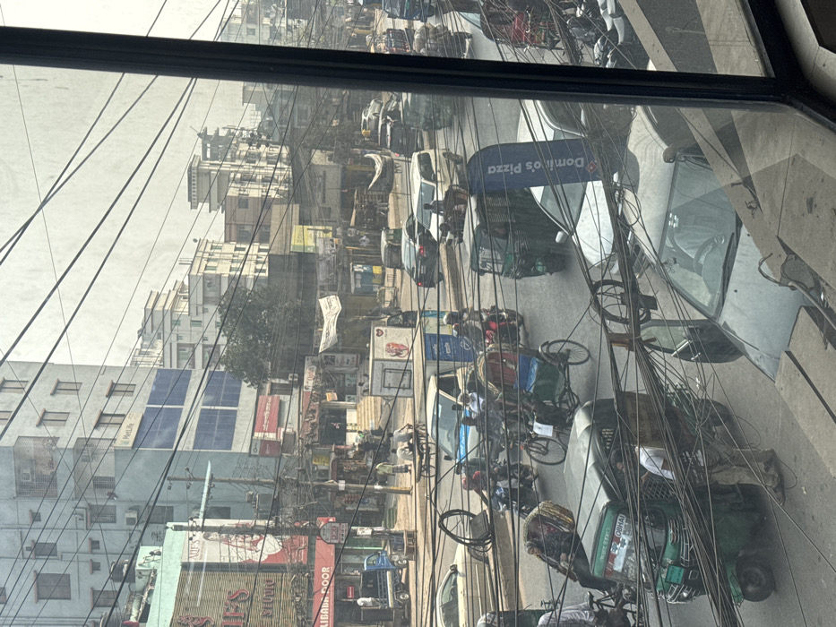 An urban street scene viewed through a window. Power lines crisscross the frame. Vehicles, including cars, auto rickshaws, and bicycles, line the street. Commercial buildings and apartments stand along the road. A Domino's Pizza delivery vehicle is visible. The light suggests a daytime scene.