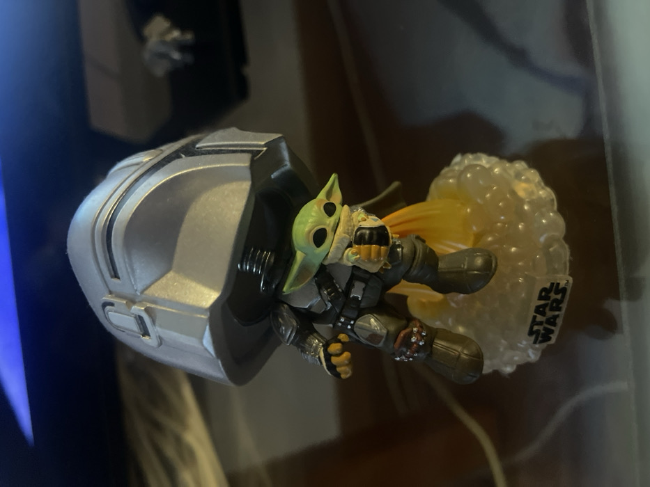 A Star Wars figurine features a Mandalorian helmet with Grogu emerging