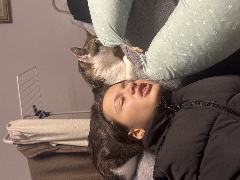 A person in a black jacket lies with eyes closed and mouth slightly open. A grey and white tabby cat rests its head on the person's hair. The pair appear to be sleeping on a grey sofa with a light green pillow behind them. In the background, a white laundry rack stands beside stacked folded laundry on a table. The photograph is lit by soft, indoor light.