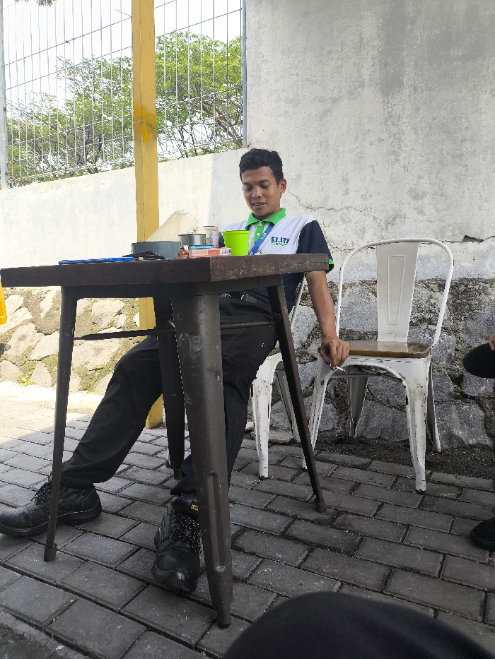 This image depicts an outdoor scene in Unknown, Indonesia. A male individual, appearing to be of Southeast Asian descent, is seated at a dark brown rectangular table with heavy dark metal legs. He wears a short-sleeved polo shirt with a white upper torso, green collar and shoulders, and a dark blue lower section featuring "ELITE" text. A blue lanyard with an ID badge hangs around his neck. He is dressed in dark trousers and black work-style boots. His right hand holds a lit cigarette, resting on the top rail of a white metal industrial-style chair with a wooden seat, positioned to his right. His left arm rests on his left thigh. His head is slightly tilted, and his gaze is directed downwards and to the right, with a subtle smile. On the table, a bright green plastic cup, several metal containers, a small rectangular package (possibly cigarettes), and other miscellaneous small items are present. The ground is paved with rectangular grey interlocking pavers. In the background, a light grey concrete wall exhibits cracks and has a textured, rough lower section. To the left, a vertical yellow metal pole is visible. Behind the wall and pole, a metal fence is discernible, backed by green foliage and a clear sky. The lower leg and dark shoe of a second individual are partially visible in the bottom right corner of the frame.