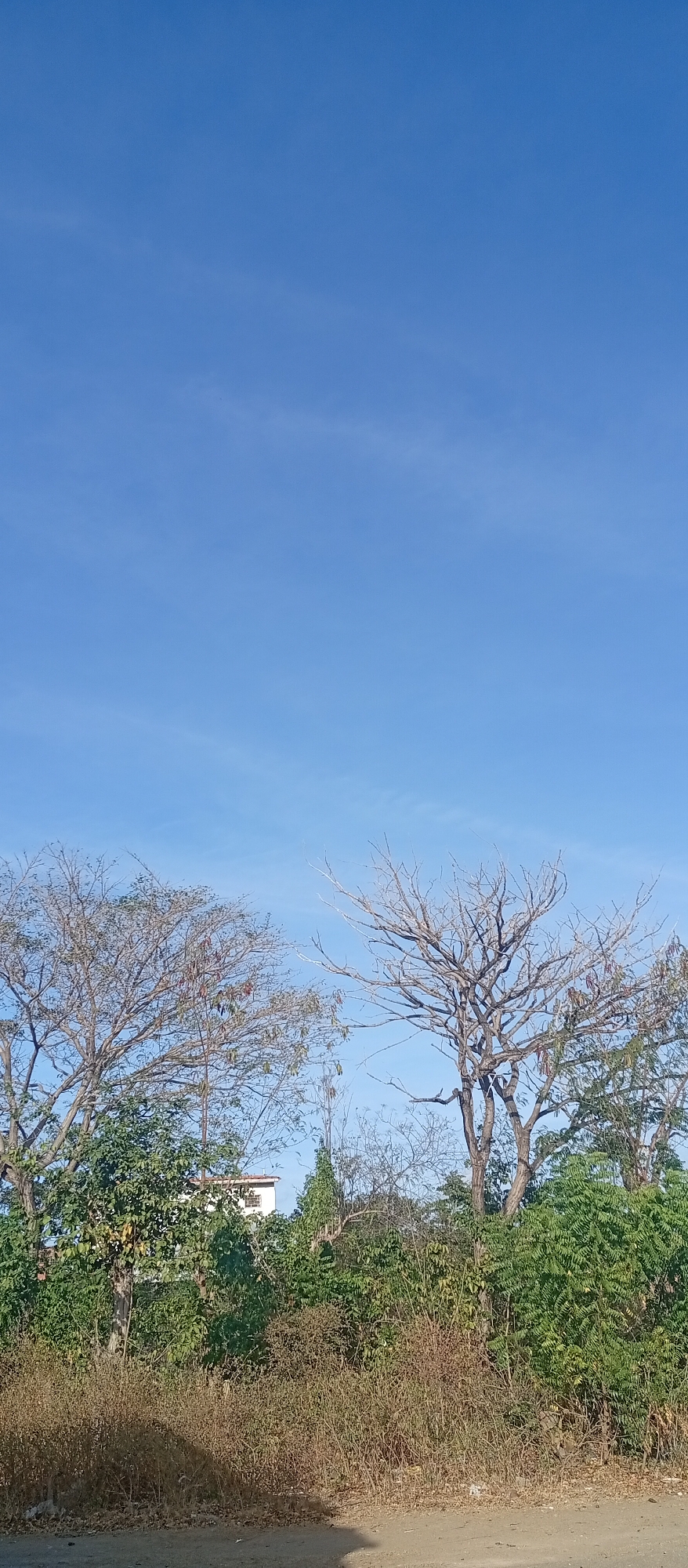 A bright, clear sky with faint wispy clouds forms the backdrop for a scene of vegetation. A mix of deciduous trees, some with bare branches and others with sparse leaves, are interspersed with denser green foliage. In the middle ground, a patch of brown, dry grass covers the foreground, suggesting a transition from a greener season. A building with a white facade is visible partially obscured by the trees in the center. The location is Juan Griego, Venezuela.