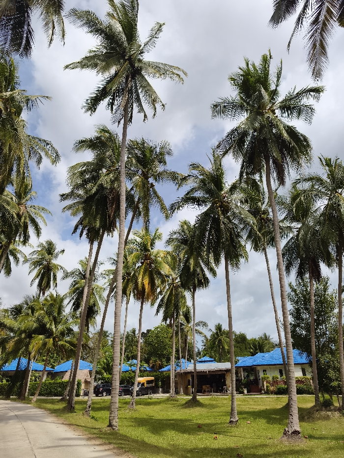 A lush tropical scene features numerous tall coconut palm trees reaching toward a sky filled with white clouds and blue patches. Below the trees is a green grassy area, and a road runs along the edge. In the background, buildings with blue tiled roofs are partially visible, suggesting a resort or residential area nestled within the palm grove. Some cars are also parked in the back.