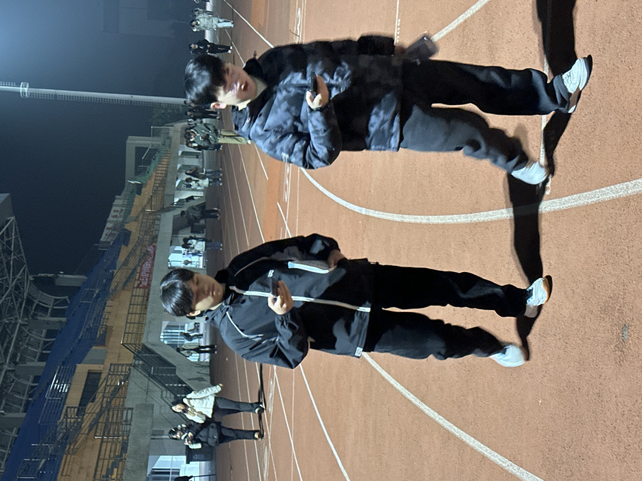 Two young males walk rightward on a red-orange stadium running track with white lane markings at night in Jiangjin, China