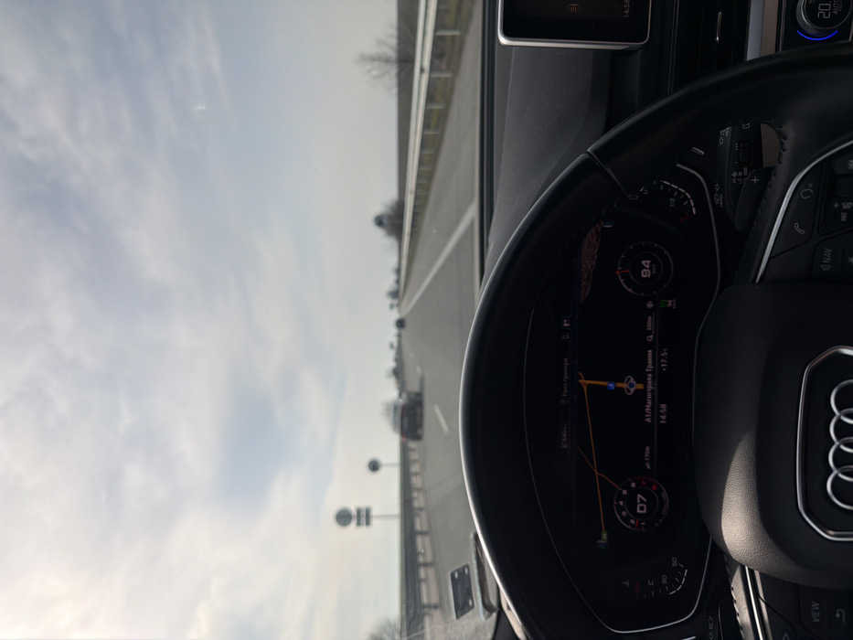 A driver's perspective image depicts a vehicle in motion on the A1/Trakia Motorway, in the vicinity of Cherna Gora, Bulgaria. The foreground is dominated by the black multi-function steering wheel of an Audi, featuring the four-ring logo at its center. Behind the steering wheel, the digital instrument cluster is visible, displaying a speed of 94 km/h, gear D7, a navigation map with a blue current location arrow and an orange route, the current time of 14:58, and an outside temperature of +17.5°C. Text on the display indicates "A1/Магистрала Тракия" (A1/Trakia Motorway) and a distance of "100m" to a point. Through the windshield, a multi-lane highway stretches into the distance under an overcast sky with patches of brighter light. Metal guardrails line both sides of the motorway. Several vehicles are visible ahead in the lanes, appearing progressively more blurred with distance. A dark-colored sedan is distinctly visible in the right lane ahead, with other vehicles further down the road. On the left side of the highway, a circular road sign with a white border and two horizontal black bars on a white background is discernible, along with other indistinct signs. Sparse, bare trees or shrubs dot the distant shoulders of the road. The windshield exhibits minor smudges or dust. No individuals are directly visible.