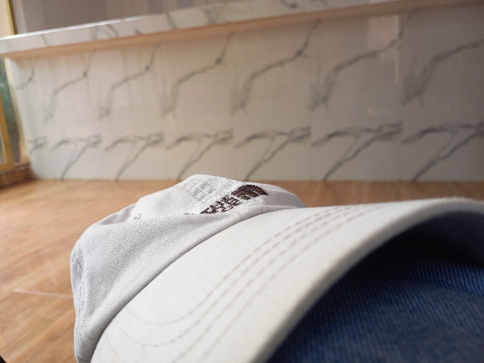 The scene depicts an interior environment in Oturkpo, Nigeria, captured from a low-angle perspective. In the immediate foreground, a white baseball cap is prominently featured, with its curved brim and parallel stitching lines visible. A dark, possibly brown, embroidered emblem or text is partially discernible on the front panel of the cap. Beneath the cap's brim and extending to the lower right, textured blue denim fabric, consistent with jeans, is visible, suggesting the cap is being worn or resting on an individual's lap. The midground features a light brown floor exhibiting a wood-like grain. In the background, a tiled wall is visible, composed of light-colored tiles with distinct grey, wavy, marble-like patterns arranged in a grid. A thin, light-colored ledge runs horizontally along the top edge of this tiled wall. To the far left, a blurred, light-colored vertical structure, likely part of a window or door frame, is present. No specific actions or interactions between individuals are depicted beyond the implied presence of the person wearing the cap and jeans.