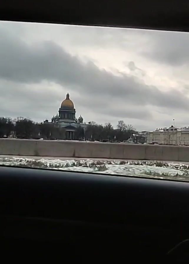 The video depicts a distant view of St. Isaac's Cathedral in St. Petersburg, Russia, as seen through a car window. The sky is overcast with gray clouds. There's a barrier in the foreground, possibly alongside a body of water with some ice or snow visible. Bare trees are scattered around the cathedral's grounds. The camera is stationary, capturing the scene as the car is likely moving.
