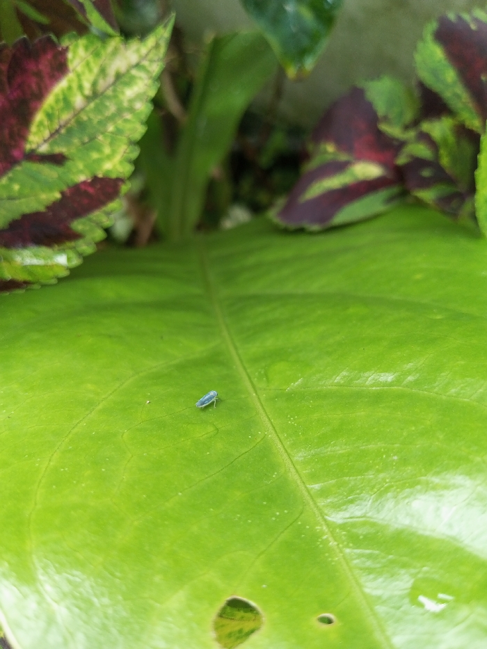 - "The image, captured in Mindat, Myanmar, displays a close-up view of a small, pale blue insect, approximately 3-4mm in length, resting on the surface of a large, vibrant green leaf" by FM-1y5G03, licensed under CC BY 4.0