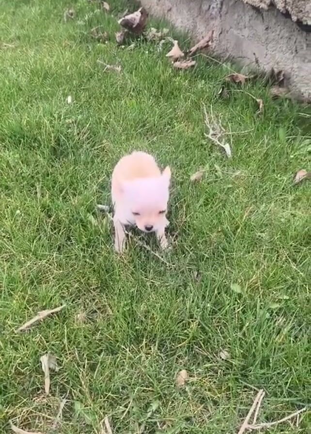 - "A small, light-colored Chihuahua puppy stands on a green lawn next to a concrete retaining wall" by FM-BjNp73, licensed under CC BY 4.0