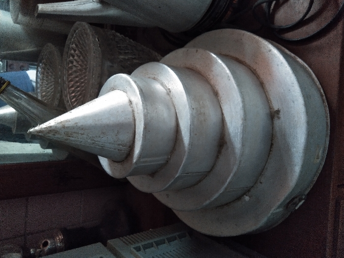 An indoor scene is depicted, focused on a central, multi-tiered metallic object resting on a dark, flat surface. The primary object is composed of a broad circular base, upon which three progressively smaller circular tiers are stacked, culminating in a distinct conical top. Its light-grey metallic surfaces show signs of wear, including minor discoloration, scuffs, and faint vertical streaks, particularly visible on the cone. To the immediate left of the central object, a portion of a light-colored, vertically stacked item, possibly a piece of an appliance or furniture, is visible. The background features a reflective surface, identified as a mirror, which displays reflections of various items: an inverted clear glass bottle, multiple clear glass vessels with prominent diamond-patterned textures, and a blurred partial reflection of an individual wearing a blue garment. To the right, a segment of another metallic object and coiled black electrical cables are present in the foreground. The scene is dimly lit, creating shadows, particularly behind and to the right of the central object. No individuals are directly present or performing actions within the immediate frame. The context provided places this scene in the city of Nijmegen, Netherlands, although no specific visual identifiers for this location are discernable within the image itself.