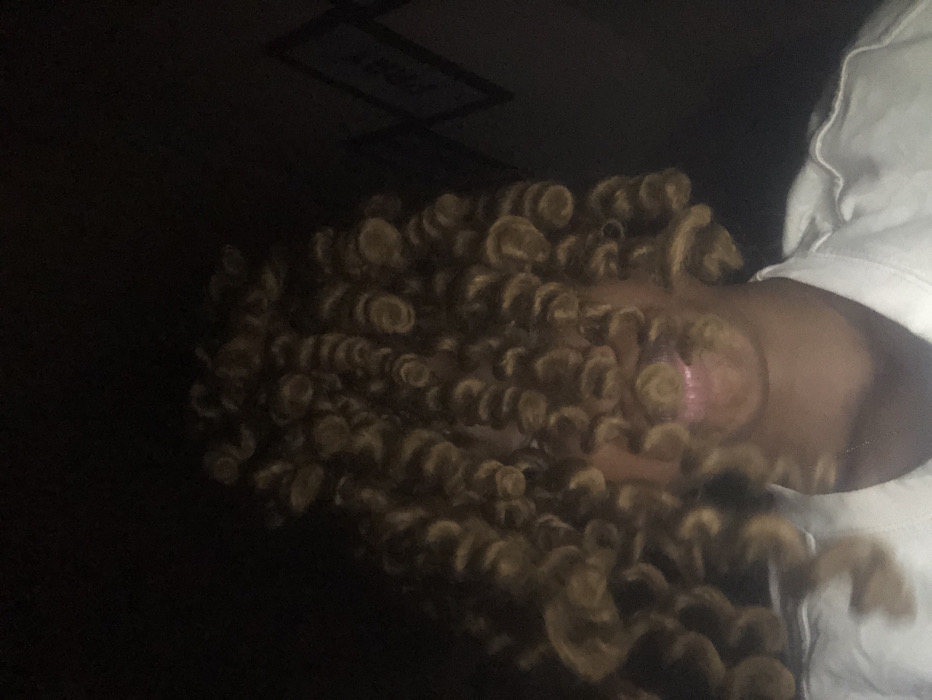 A person with curly, blonde hair, wearing a white shirt, is positioned on the right side of the image. The background is dark, with a rectangular shape visible towards the top, possibly a ceiling fixture or a shadow. The curls are dense and appear to frame the person's face, though the face is not fully visible.