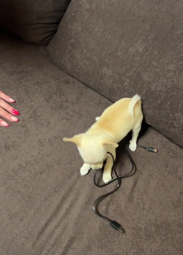 Here is a brief description of the video: The video shows a small, light-colored chihuahua puppy on a brown couch. A hand with a ring and nail polish is also visible. The puppy is playing with a black USB cable. The hand then picks up the cable and moves it around, encouraging the puppy to chase it.