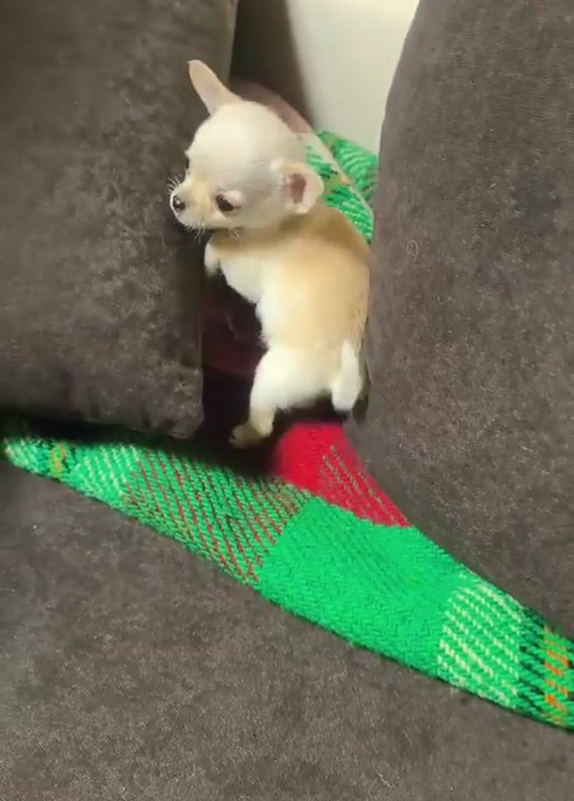 A tan and white chihuahua puppy stands between two dark brown throw pillows, atop a green and red plaid blanket on a gray couch. The puppy shifts from side to side and sticks its tongue out. A hand comes into the frame holding a black TV remote, then moves out of the frame. The puppy remains in place.