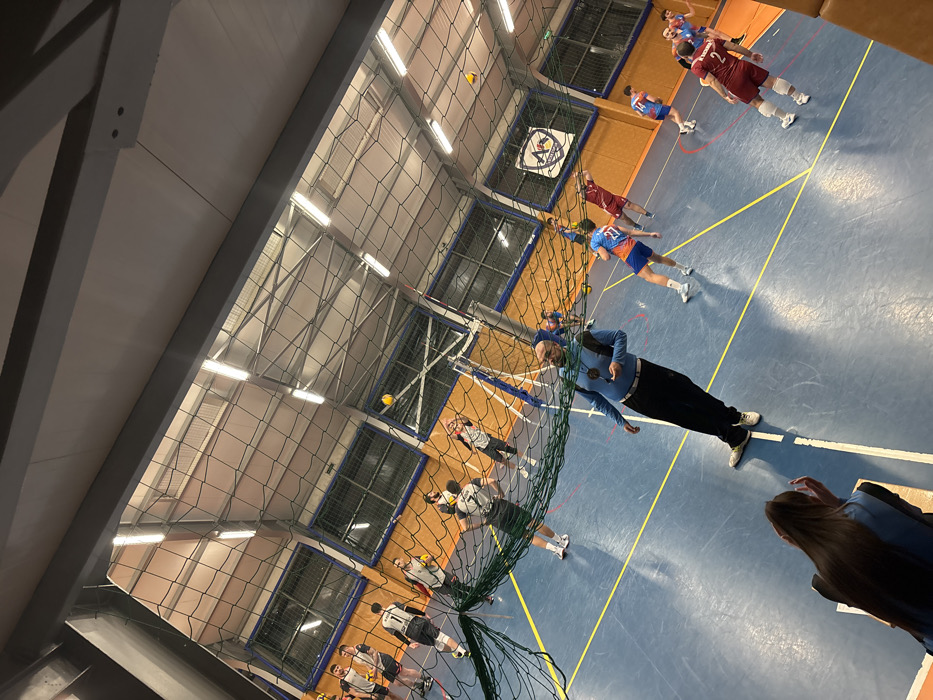 The image depicts an active indoor volleyball scene within the Arena Armeec (Arena Sofia) in Sofia, Bulgaria. The gymnasium features a blue multi-sport court with yellow and white boundary lines. The ceiling is high, with exposed steel trusses and numerous long fluorescent light fixtures providing illumination. Dark, gridded windows or vents are visible along the upper walls. A green mesh volleyball net is positioned prominently in the foreground, partially obscuring the court. Beyond this net, approximately 15 male individuals, appearing to be players, are distributed across the court. They wear distinct uniforms: some in black, grey, and white (e.g., #1, #7), others in orange and blue (e.g., #21, #14), and a third group in maroon (e.g., #2). Multiple yellow volleyballs are in play, with at least two visible airborne above the primary net. Players are in various active postures consistent with volleyball, such as preparing to hit, blocking, or receiving. A male individual identified as an official or coach stands near the foreground net. He possesses a beard, wears glasses, a light blue long-sleeved shirt, dark pants, and has a whistle hanging from a lanyard around his neck. In the lower left corner of the image, a person with long dark hair, wearing a light blue top, is seated, facing away from the camera, seemingly observing the activity. A banner displaying a logo with the letters "AM" within a crest is affixed to the far wall, confirming the venue as Arena Armeec.