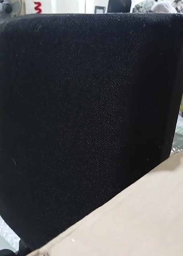factory floor from a fixed, low angle, with the back of a black chair prominent in the foreground. A worker wearing ear protection is visible in the background, operating a large, white piece of machinery with a digital control panel. The worker is seated and seems to be monitoring the machine. The factory environment includes other equipment, boxes, and conveyor belts, all suggesting an industrial setting. A loud mechanical noise is audible in the background.