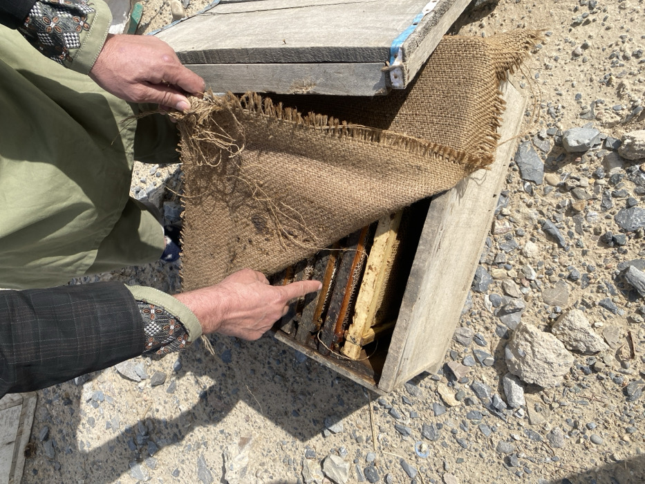 - "In Nakhonay, Afghanistan, a partial view of an individual shows their hands engaged with a wooden beehive on rocky, dusty ground" by FM-B5wmg2, licensed under CC BY 4.0