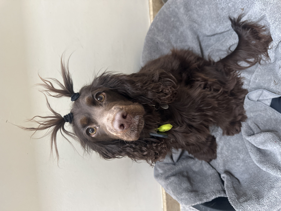 A dark chocolate brown cocker spaniel or similar long-haired dog is depicted sitting indoors, looking directly forward. The dog features two distinct tufts of its top fur styled into upright bundles with black elastic bands. Its eyes are large and dark, and its nose is pinkish-brown. A dark-colored collar is visible around its neck, adorned with a bright yellow tag and a circular metallic tag. The dog is positioned within a dark, possibly black, circular dog bed, which is lined with a grey terry cloth towel. The background consists of a plain, light-colored wall, with a strip of light brown tiled or concrete flooring visible at the bottom right. The precise location within Wealden, UK, is not discernible from the image.