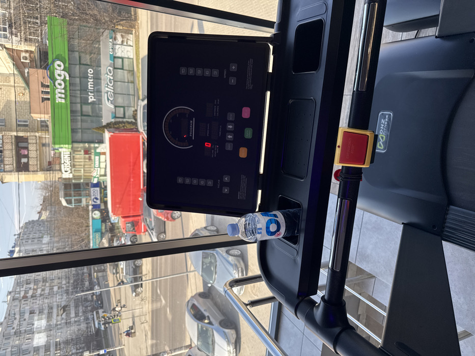The image presents an interior perspective, looking outward through a large window onto an urban street. In the foreground, the console and handlebars of a black DHZ Fitness treadmill are prominent. A transparent plastic bottle labeled "OM" containing water is situated in a cup holder on the treadmill's console, which displays red digital text, including "PROGRAM" and a numeric value "0". A red emergency stop button with a yellow rectangular frame is affixed to the right handlebar of the treadmill. A silver metal handrail is visible on the left side, indicating internal architectural elements. The exterior scene is identified as Strada Burebista 2, Chișinău, Moldova. The street below features vehicular traffic, including multiple cars and a large red truck. Two silver hatchback vehicles are parked in the lower left quadrant of the street view. Pedestrians are observable on the sidewalks and in the process of crossing the street. Buildings lining the street display various commercial establishments on their ground floors, with visible signage including "mogo" (green), "Crisant" (green), "Primero" (white), and "Felicia Optica" (white). Residential floors are situated above the commercial spaces. The sky is clear, and trees in the background appear with bare branches.