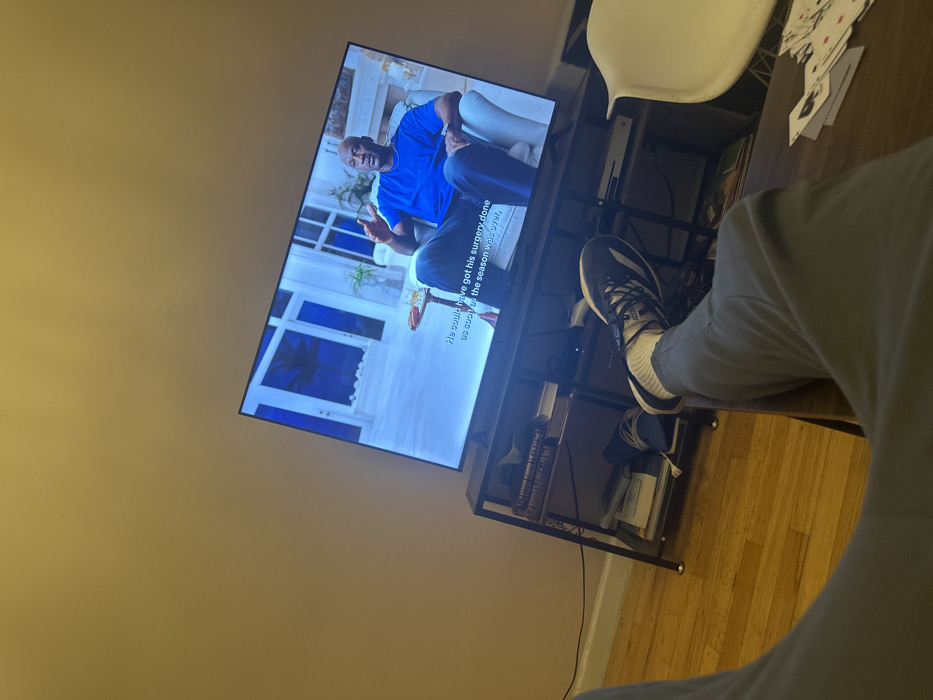 A man in a blue shirt is on the TV. The TV is sitting on a black metal stand with shelves. Below the top shelf, there are books. A leg is on top of the shelf. The leg is wearing a grey shoe and a white sock. The person is wearing light grey pants. The background is light beige on the left and there is a white chair with a wooden floor on the right.