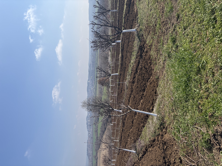 The image displays an agricultural field near Suhache, Bulgaria, under a clear blue sky with scattered white cumulus clouds. The foreground consists of patches of green grass transitioning into dark brown, freshly tilled earth arranged in rows. Numerous deciduous trees, currently bare of leaves, are systematically planted throughout the tilled land, with many exhibiting white-painted lower trunks. These trees are organized in discernible rows. In the mid-distance and background, additional bare trees and undulating green and brown fields are visible. The far horizon reveals a compact urban area, identified as Suhache, with various buildings and structures. No individuals or specific actions are depicted within the scene.