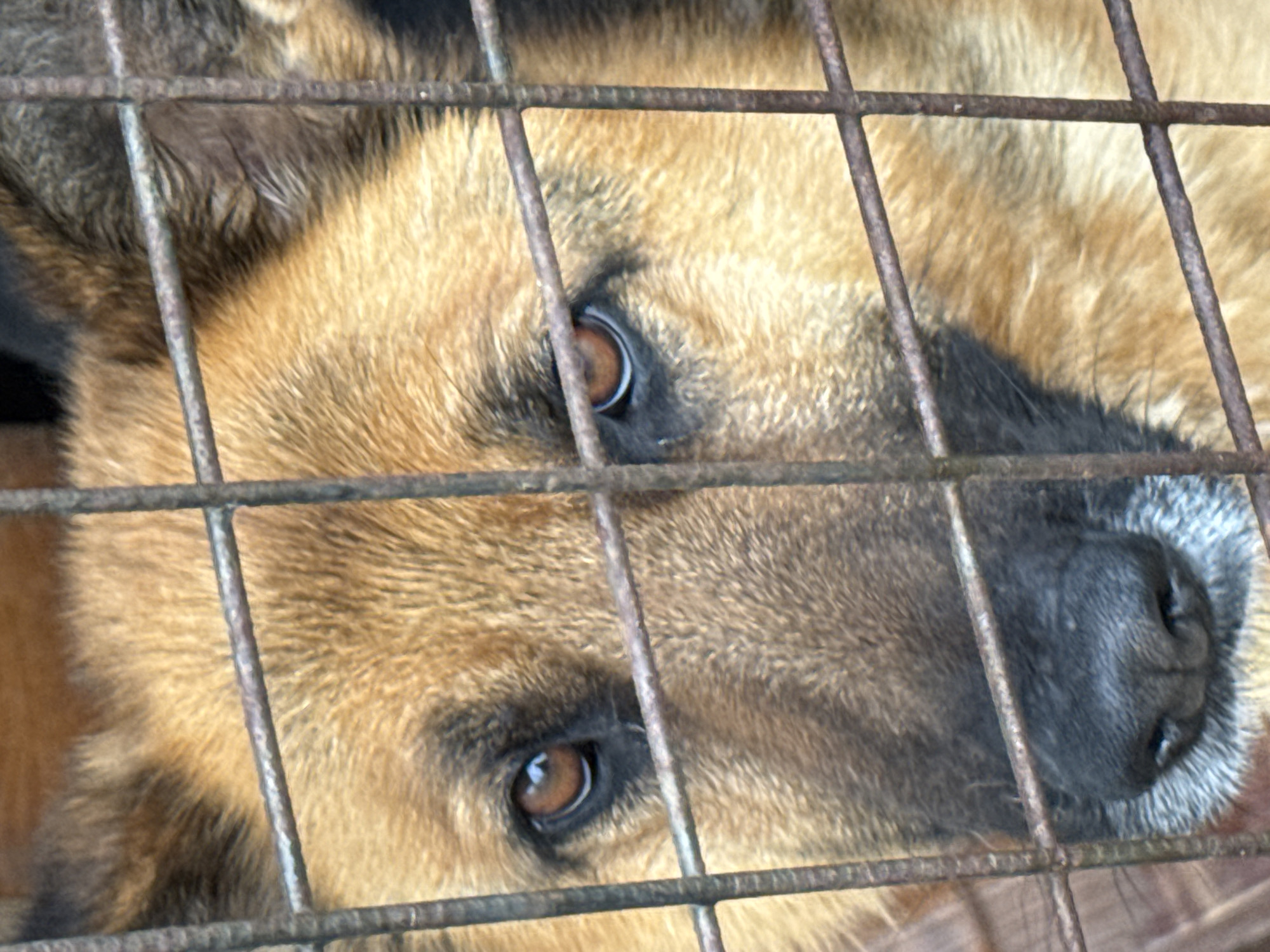 - "A close-up image displays the head of a German Shepherd dog, or similar large breed, positioned behind the rusty metal bars of a cage or enclosure" by FM-fYcxL2, licensed under CC BY 4.0