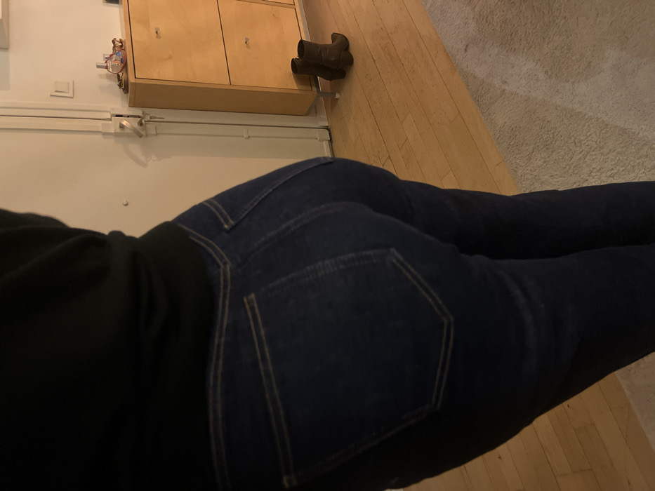 close-up, angled view of a person's lower back and buttocks wearing dark blue jeans. The jeans have visible back pockets with lighter-colored stitching. A black top partially covers the back on the left side. In the background, there is a wooden cabinet or shelf, a white wall with a silver bar, a pair of brown shoes, a wooden floor, and a carpet. The lighting is dim, casting shadows.