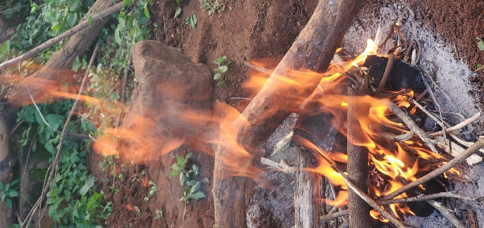 The image depicts an active ground fire in Kitonyoni, Kenya. Multiple wooden sticks and logs are burning, producing distinct orange and yellow flames. Gray ash is visible at the base of the fire, which rests directly on reddish-brown soil. In the mid-ground, behind the fire, a large, dark brown rock is present. The background features additional fallen logs and sparse green vegetation, including small plants and leaves, on the soil. No individuals or structures are visible.