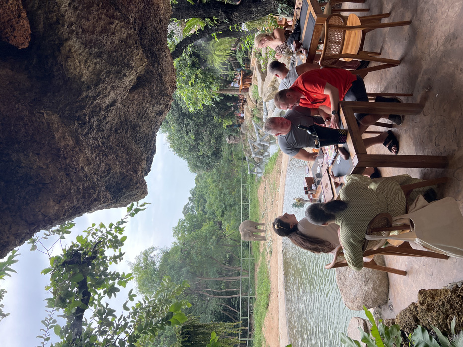 People are seated at wooden tables with chairs at what looks like an outdoor restaurant, possibly in a cave-like structure. A body of water is adjacent to the tables, and across the water, there is a small elephant in the distance. The people at the tables appear to be enjoying food and drinks, with a bottle of wine visible on one table. The scene suggests a unique dining experience in a natural setting.