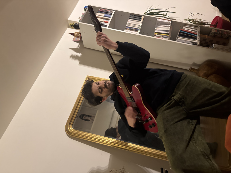 A man plays an electric guitar in front of a mirror, capturing his reflection. He wears a dark hoodie and green corduroy pants. The guitar is red. Behind him is a white bookshelf filled with books and magazines, and some greenery. A gold-framed mirror hangs on the wall to his left. The image is taken at an angle, giving it a dynamic perspective.