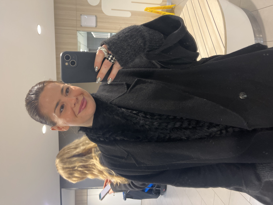 A woman in a black coat and sweater takes a selfie with a smartphone. She wears multiple rings on her left hand, which is holding the phone. Her nails are painted a metallic silver. The coat has a fuzzy trim at the neck. Another person with blonde hair is partially visible in the background, also holding a phone. The surroundings appear to be an indoor public space with light-colored walls and a bench in the background.