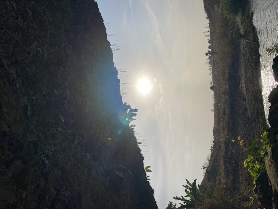 A low-angle shot reveals a deep, narrow gorge. Jagged rock formations rise on the left, shrouded in shadows, with sparse greenery clinging to its surface. On the right, the terrain is drier, with muted vegetation and a glimpse of a waterfall cascading over rocks. A bright sun, high in the sky, washes out the scene, creating lens flare and obscuring details in the sky above. The perspective accentuates the depth and height of the natural formations.