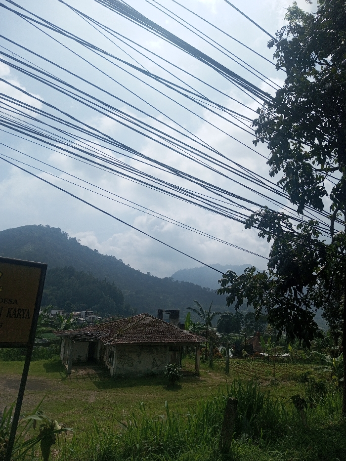 The image displays a rural or semi-rural landscape within the city of Niz Lakuk, India, under a sky characterized by both clouds and visible blue patches. Numerous black wires, likely electrical or communication lines, stretch diagonally across the upper portion of the frame. In the immediate foreground, green grasses are prominent. A yellow rectangular sign is partially visible on the left, displaying the words "DESA" and "KARYA". To the right, a large tree with dark green foliage occupies the extreme right side of the image. The mid-ground features a dilapidated, single-story house with a distinct red-tiled roof. Its light-colored walls show signs of weathering and staining, and a porch structure is visible at the front. Adjacent to this house, a cultivated garden plot is discernible, along with other green vegetation, including banana trees. Further into the mid-ground, additional structures and dense tree cover suggest a scattered settlement. The background is dominated by a series of rolling, forested mountains under a hazy atmosphere. No individuals are present, and no specific actions or interactions are depicted within the scene.