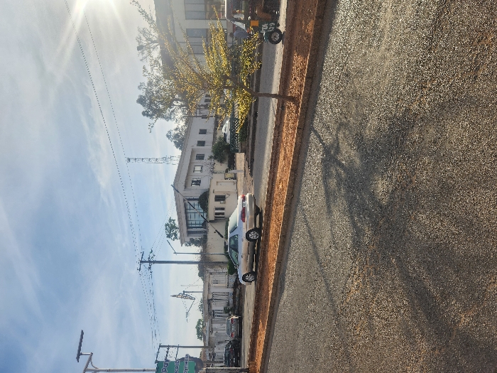 A street scene presents a view of buildings under a bright sky with sparse clouds. Utility poles are visible, and a tree with yellow leaves adds a touch of color. A silver car is parked along the curb, next to a sidewalk, while a motorized rickshaw is visible further up the street. The street surface is rough and textured, showing long shadows, and the overall lighting suggests a sunny day.